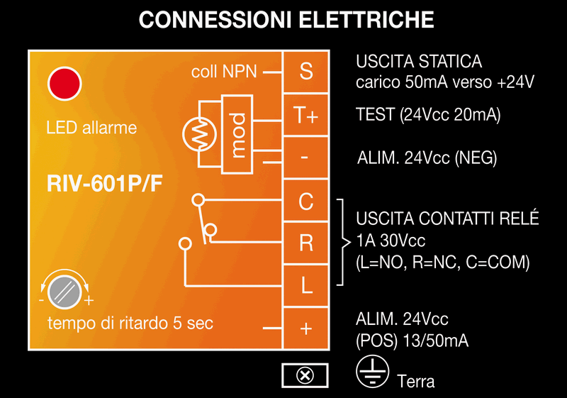 • Uscita su contatto di scambio SPDT 1A 30Vcc. Altra uscita statica su collettore NPN che va basso in allarme e porta 50 mA 24Vcc.