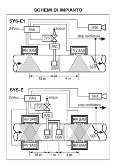 Il tipo “A” è il sistema semplice piccolo, adatto per tubazioni ‘piccole’, con diametro fino a mezzo metro. Comprende un solo rivelatore e un solo ugello spruzzatore.
